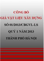 Công bố số 01/2013/CBGVL-LS ngày 01 tháng 3 năm 2013 của liên sở Tài chính – Xây dựng thành phố Hà Nội công bố bảng giá vật liệu xây dựng quý 1 năm 2013 thành phố Hà Nội, làm căn cứ cho các tổ chức, cá nhân tham khảo, lập và quản lý chi phí đầu tư xây dựng đối với các công trình xây dựng trên địa bàn thành phố Hà Nội