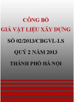 Công bố số 02/2013/CBGVL-LS ngày 01 tháng 6 năm 2013 của liên sở Tài chính – Xây dựng thành phố Hà Nội công bố bảng giá vật liệu xây dựng quý 2 năm 2013 thành phố Hà Nội, làm căn cứ cho các tổ chức, cá nhân tham khảo, lập và quản lý chi phí đầu tư xây dựng đối với các công trình xây dựng trên địa bàn thành phố Hà Nội.