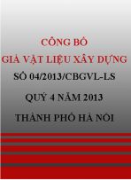 Công bố số 04/2013/CBGVL-LS ngày 01 tháng 12 năm 2013 của liên sở Tài chính – Xây dựng thành phố Hà Nội công bố bảng giá vật liệu xây dựng quý 4 năm 2013 thành phố Hà Nội, làm căn cứ cho các tổ chức, cá nhân tham khảo, lập và quản lý chi phí đầu tư xây dựng đối với các công trình xây dựng trên địa bàn thành phố Hà Nội