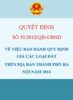 Khung giá đất Hà Nội 2013 được UBND thành phố Hà Nội ban hành kèm theo quyết định số 51/2012/QĐ-UBND ngày 28/12/2012, để các tổ chức, cá nhân có liên quan tham khảo, làm căn cứ để áp dụng trong các trường hợp: tính thuế, tính giá trị quyền sử dụng đất, tính tiền sử dụng đất và tiền thuê đất, tính toán để bồi thường khi thu hồi đất….(LDTN)