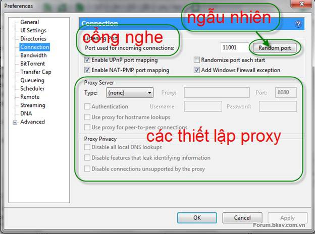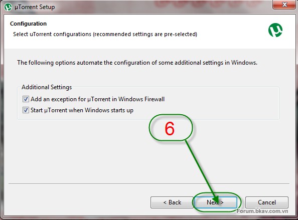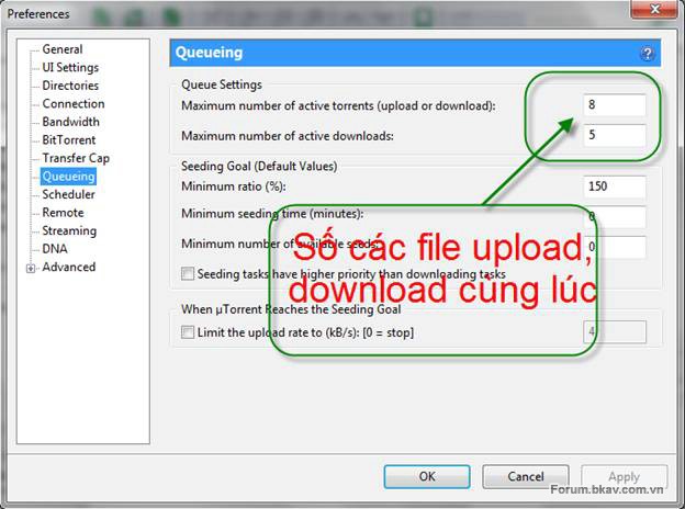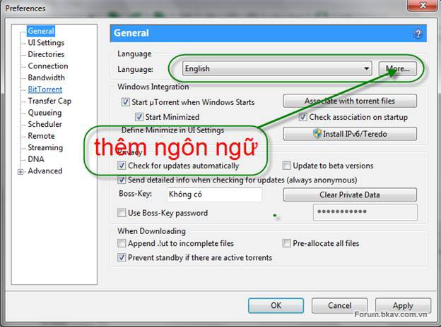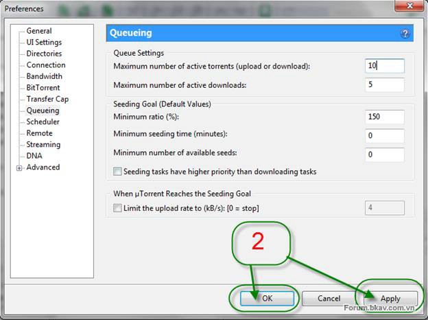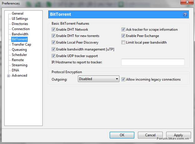 Tiếp đến ở cửa sổ BitTorrent bạn thiết lập các thông số như trên.