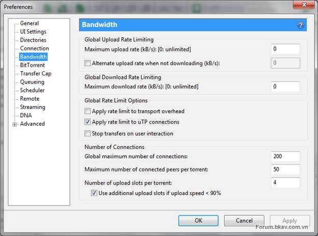 Global Maximum upload rate (kb/s): Tốc độ upload cao nhất có thể. Bạn nên thiết lập bằng 80% tốc độ upload thực tế của bạn. Mình để "0" (không giới hạn), ngoài ra còn có tốc độ giới hạn upload khi đang download ở dòng dưới, bạn nên cân nhắc để lựa chọn hợp lý!