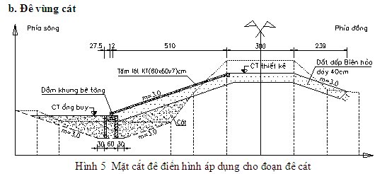 Với những đặc điểm địa hình, địa chất, dòng chảy … như đã nêu trên, đơn vị tư vấn đã đề xuất các giải pháp thiết kế đê phù hợp với đặc điểm của từng khu vực trong vùng dự án. Theo đó, có 3 giải pháp thiết kế cho 3 đối tượng: (1) Đê nâng cấp mở rộng, (2) Đê vùng cát;(3) Đê đắp mới trên nền đất yếu. Ứng với mỗi giải pháp thiết kế, có các phương án thiết kế mặt cắt đê phù hợp. Các mặt cắt đê điển hình [3]: