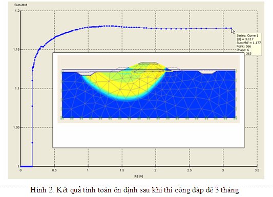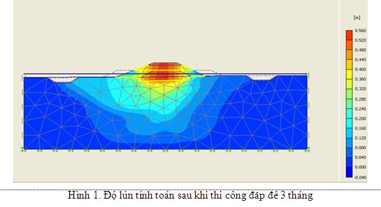 Ban đầu với số liệu địa chất như đã được cung cấp, việc tính toán dự định sử dụng mô hình Mohr-Coulomb để mô phỏng đất yếu, đất đắp và dùng mô hình “vải địa kỹ thuật” với các thông số chống kéo EA, EI. Tuy nhiên khi chạy chương trình, hầu hết mới hết pha đắp thứ 1 sang pha đắp thứ 2, đều bị báo lỗi “đất bị phá hoại” và chương trình tự động dừng lại. Không riêng dự án Thượng Mỹ Trung, nói chung các dự án khác việc mô phỏng đất yếu bằng mô hình Mohr-Coulomb đều có những hạn chế nhất định. Trong dự án này, sau đó việc mô phỏng đất yếu đã sử dụng mô hình SSC (Soft Soil Creep). Tuy nhiên, vì thông số khảo sát địa chất không đáp ứng được đầy đủ. Vì vậy, dự án đã tham khảo thêm tài liệu của công trình tương tự và sử dụng một số công thức kinh nghiệm của nước ngoài [1]. Kết quả đo đạc tại các mặt cắt tính toán cho thấy có thể chấp nhận được (độ lún tính toán DTT = 0,56 m so với độ lún đo đạc DQT = 0,48 m). Bài học ở đây là đối với đất yếu nên sử dụng mô hình vật liệu phi tuyến để mô phỏng sự làm việc. Tuy nhiên, tùy thuộc loại đất mà cân nhắc nên sử dụng loại mô hình vật liệu SS (Soft Soil) hay SSC (Soft Soil Creep) cho thích hợp. Lưu ý rằng, việc chọn loại mô hình nào để tính toán sẽ liên quan đến yêu cầu khảo sát địa chất ngay từ đầu.