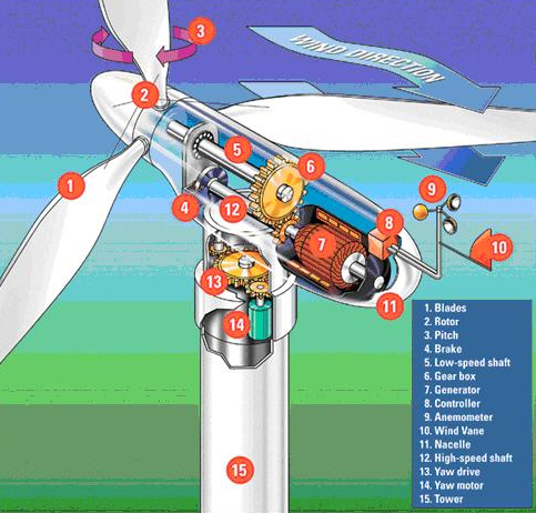 - Pitch: Bước răng. Cánh được xoay hoặc làm nghiêng một ít để giữ cho rotor quay trong gió không quá cao hay quá thấp để tạo ra điện.