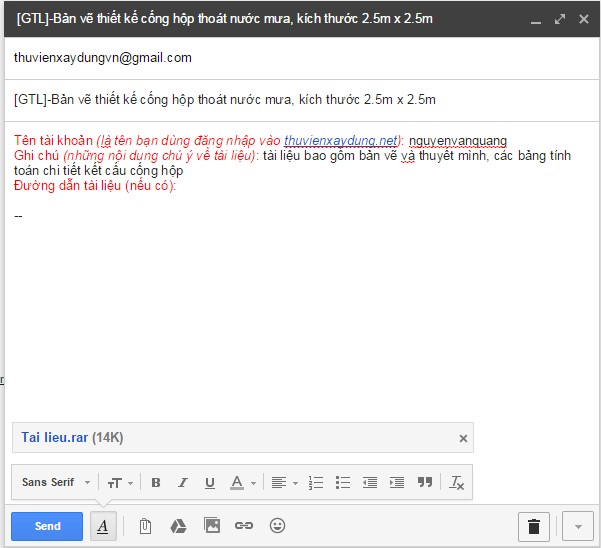 - Sử dụng email đã dùng để đăng ký tài khoản trên thuvienxaydung.net để gửi tài liệu cho chúng tôi với nội dung thư mẫu như sau: