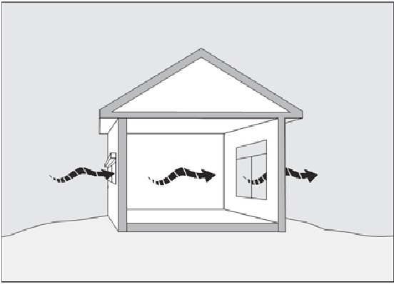 Lối vào và lối ra nằm ở vị trí đối diên nhau chỉ có thể làm mát cho không gian chính giữa và hướng của dòng khí. Bạn có thể làm mát nhiều vị trí khác nữa nếu dẫn không khí đi xa hơn giữa lối vào và lối ra. Sử dụng các cửa sổ mở nhỏ hơn cho lối vào và rộng hơn cho lối ra. Điều này sẽ làm tăng tốc độ gió và cải thiện hiệu ứng làm mát. Không khí từ nơi mát hơn và nơi có bóng râm sẽ là nguồn khí lấy vào tốt nhất.